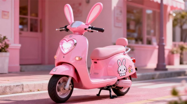 通體粉紅色,印著可愛卡通兔子圖案,還帶著兩個長長兔耳朵的小型電動摩托車,出現在林野面前。