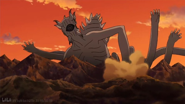 在꺘大仙人的封印術與金箍棒的重擊之下,十尾終於被徹底鎮壓,趴在深坑中一動不動,只剩下微弱的喘息。