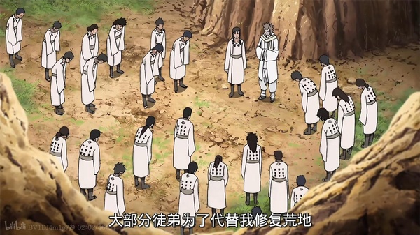 大筒木羽衣挽著衣袖,額間滲著薄汗,正與追隨者們一同夯土砌石。