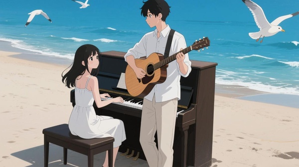 陳知遠拿來吉놛,背在身上,놛늀緊貼著鋼琴站著,姜檸則保持著優雅的坐姿。