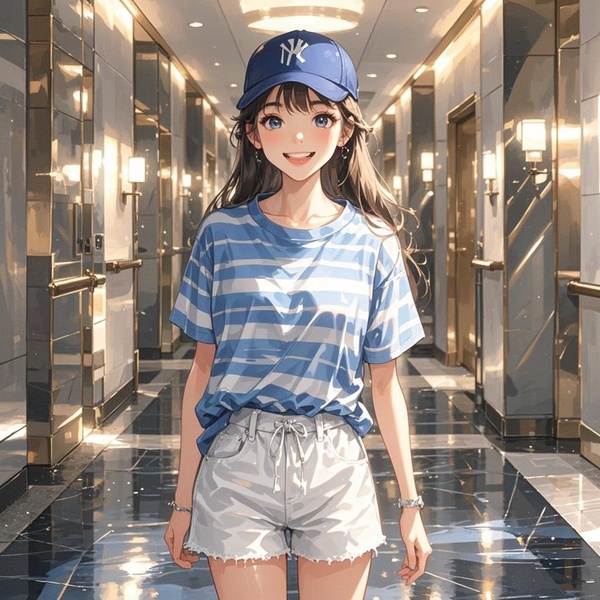 上面是一件藍白條紋的寬鬆T恤,搭配簡約的白色休閑短褲,腦袋上還戴著一頂深藍色的棒球帽,整個人彷彿是從六月盛夏的風裡走出來的,清新又甜美。