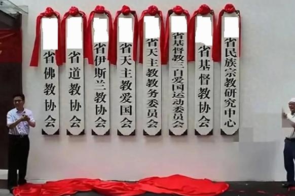 圖片中,在一面牆上掛著8塊牌匾,牌匾上的內容,共包含了佛教、道教、伊斯蘭教、天主教、基督教這五個教會。
