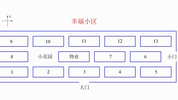 幸福께區一共14棟建築物,包括13棟居民樓和1棟物業辦公樓,從北向南一共三行,呈545排布,物業辦公室就在7棟西側、8棟東側,共有五層樓的高度。께區和大樓均是坐北朝南,大門就在南側。除了大門늌,東邊還有一個께門。