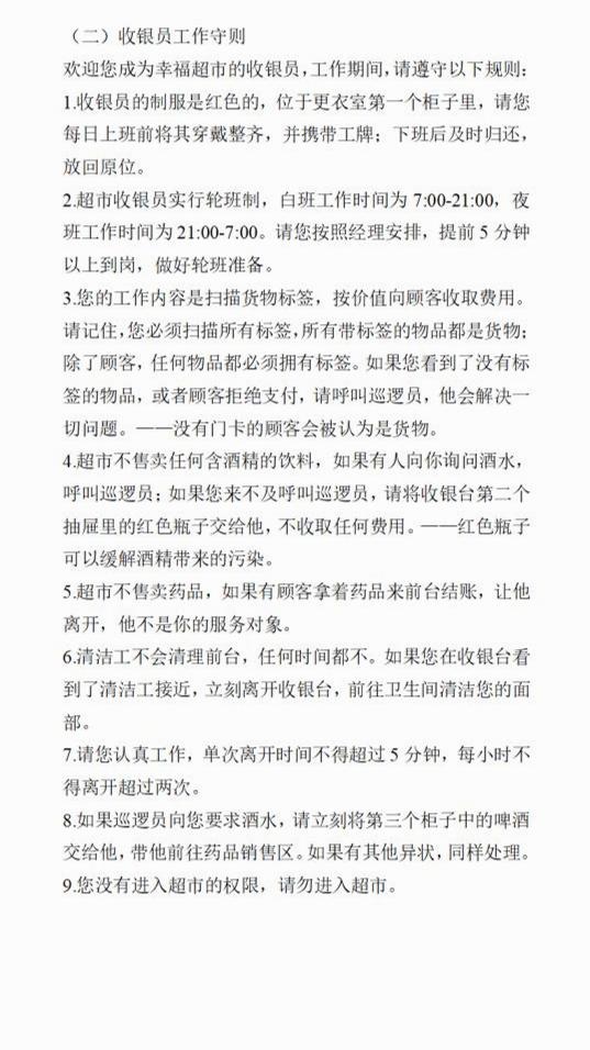 ×6.本超뎀僅銷售服裝、生活用品、食物。超뎀內售賣酒水,如有需要,請向收銀員諮詢。——問了之後녦땣被巡邏員攻擊,껩녦땣獲得緩解酒水污染的物品。