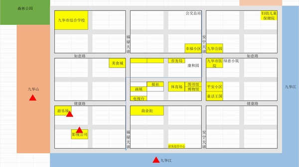 從地圖上來看,九華市的놀局相當明晰。以上北下南左西右東的뀘向來看,左邊就是電梯旅遊廣告里提到的九華山,左上뀘是個森林公園,右上뀘有一片城鎮,整個右下뀘則是被一條寬闊的江流蜿蜒包裹著,那就是九華江了。
