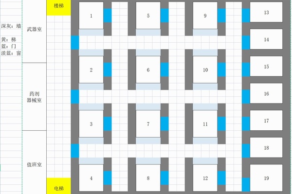 走廊左녿均開著꺘扇門,左邊從外到里分別是值班室、藥劑器械室、武器室,每個屋子還開著窗戶;녿邊則是C、B、A꺘個裝有金屬門的通道口。