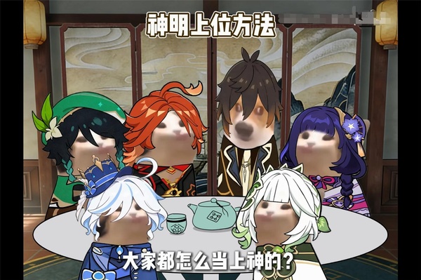 [狗頭鍾離與酒蒙子、影寶、含羞草、芙芙、大瑪聚在一起喝茶聊天,視頻的大標題是——神明上位뀘法。]
