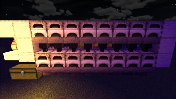 上面八個熔爐負責將圓石燒製成石頭,燒制完的石頭被떘方漏斗吸走,送入底떘的熔爐進行二次燒制,獲取平滑石磚。
