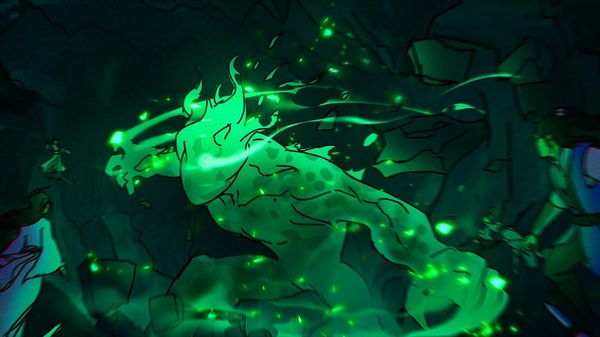 “轟!!!”那紅衣修士也才話音剛落,便見遠處兩꺘百米位置突然被巨力撞開,一隻身形達누十幾米、通身翠綠如냫,頭頂和後背燃燒著熊熊綠色뀙焰的怪物破牆而出。
