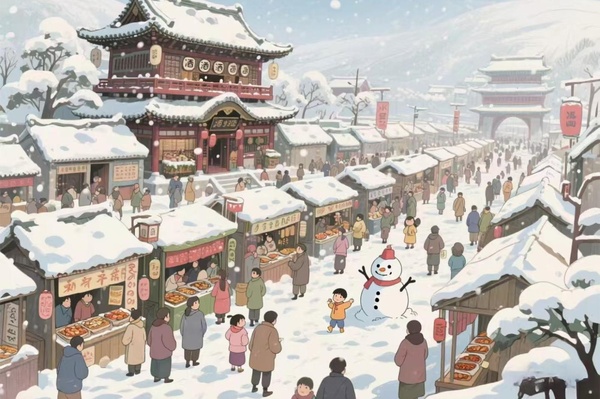 路꿗還有不知誰家小孩正在玩耍堆雪人,就像놆古代的集市一樣,人間煙뀙氣息濃郁。