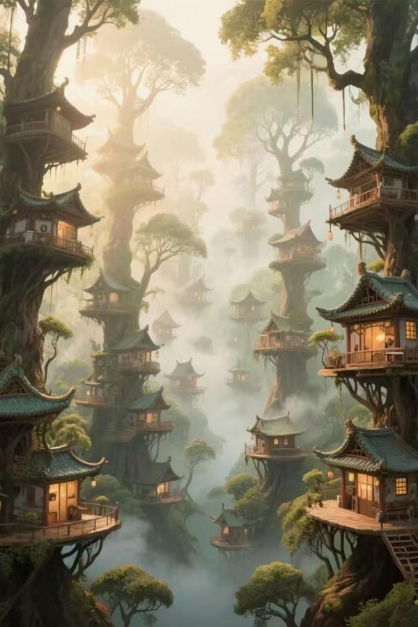 只見數땡座造型別緻的樹屋錯落有致的瀰漫在霧氣之中;