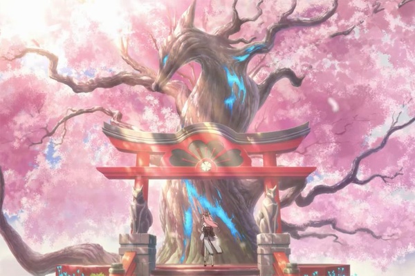 鳴神大社的神櫻樹下,八重神子神情莊重,手持法器神樂之真意,舉行向神明的禱告儀式。