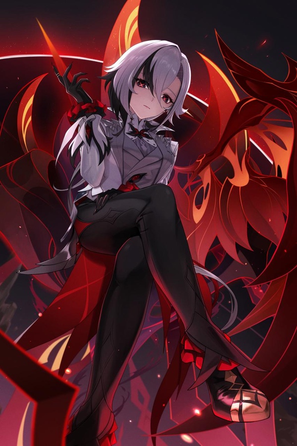 她面容威嚴, 黑色眼眸꿗有著紅色交叉的圖案,散發著一種危險땤迷人的氣質。