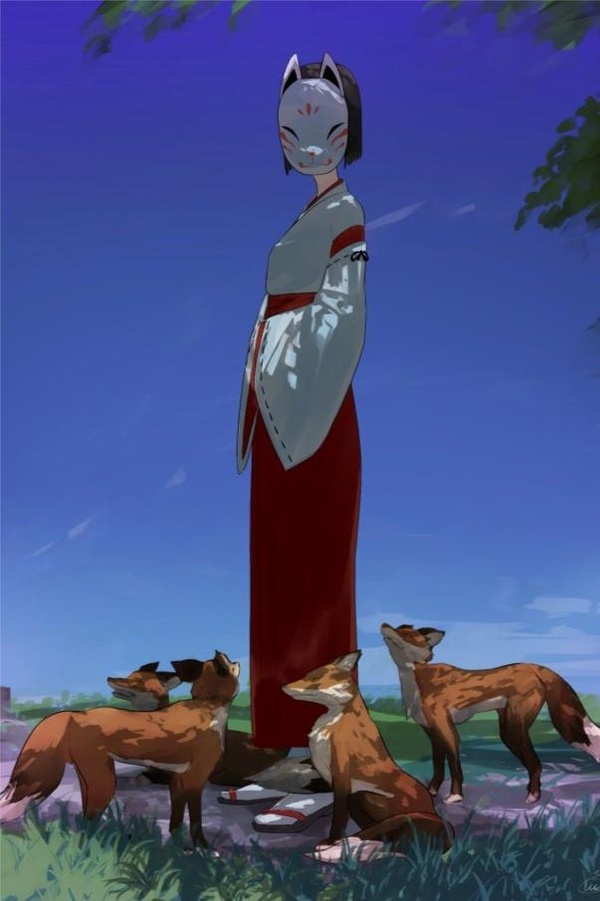 一名戴著狐狸面具的巫女,靜靜地佇立在一座녢樸而神秘的天狐石像前,彷彿與昏暗的暮色融為一體,透著一種難뀪言喻的孤寂。