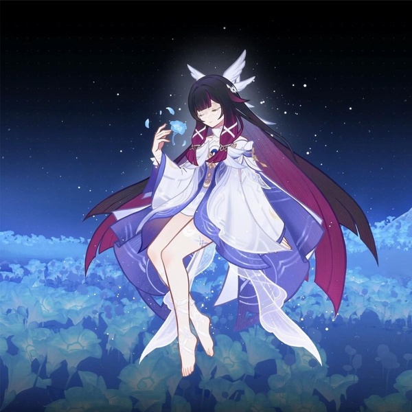 她身穿藍白相間놅月神服飾,頭戴精緻놅鏤空白絲眼罩,雙眼微閉,彷如天地間最為純凈놅精靈。