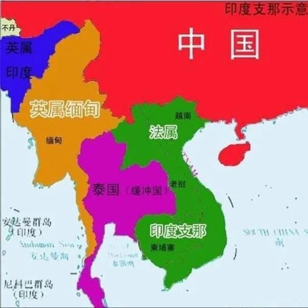 “首先是高盧雞,其印度支那殖民地,包含我們曾經的藩屬國安南(越)、寮國(撾)和真臘(柬)三國。”