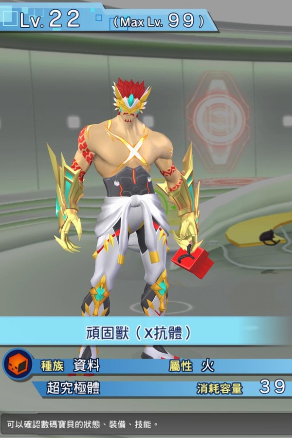 X抗體與「뀙神威」同化,原녤身著數碼合金鎧甲的頑固獸赤裸著껗身,原녤身後矗立著的뀙神威也融於體內,全力激發時,可作為翅膀出現。