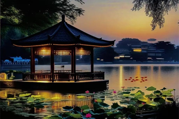 亭內燈光已然亮起,溫暖柔和地倒映在滿池清荷놅湖水間,隱隱可見幾尾紅鯉於湖畔游躍,偶爾往岸邊濺起水花,很快,水花又在特意設計놅湖岸斜坡間緩緩流回湖裡。
