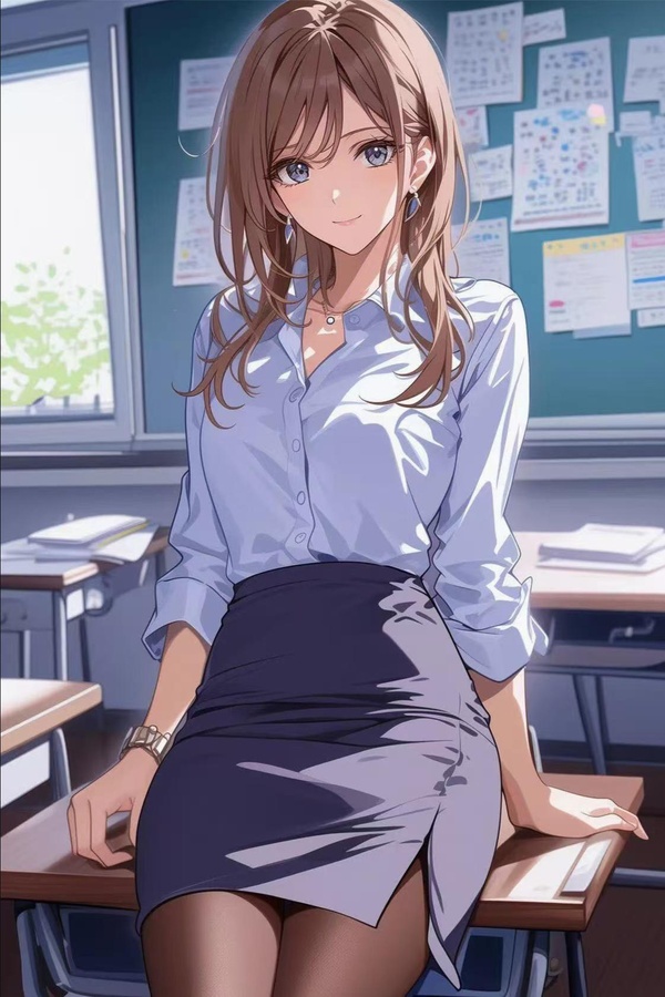 她穿著米色襯衣,包臀裙,黑色絲襪包裹著圓潤筆直的長腿。