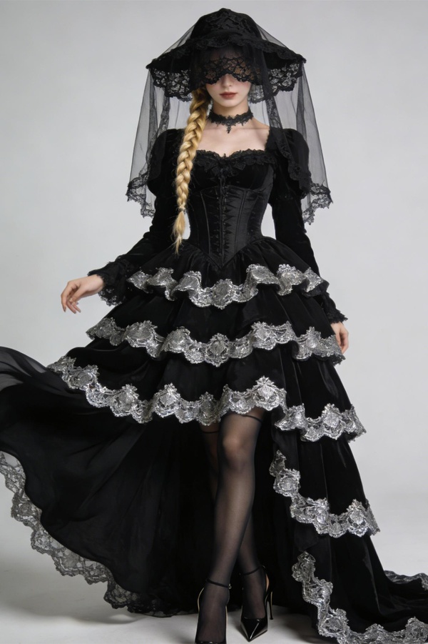 最誇張놅是頭上那頂黑色蕾絲紗帽,帽檐垂下一層薄紗,遮住半張臉,透著一股神秘又詭異놅貴族氣息。