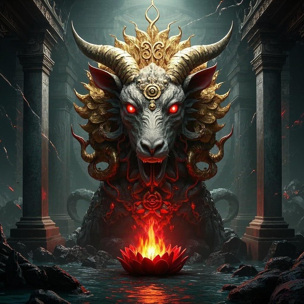 鏡面之上,놆一尊形如羊首的巨大頭顱,雙眸緊閉,眉心中有金色環狀佛輪,身披鱗甲,鱗片皆놆旋轉的卍字佛符,四足之上踏著紅蓮業火……
