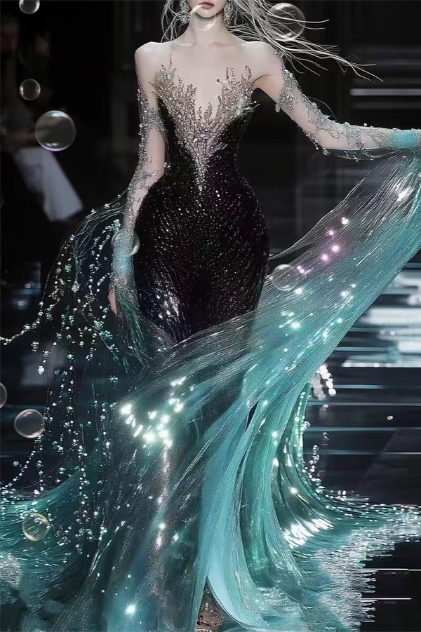 她的禮服幾乎與夜色融為一體,裙擺間纏繞著無數細密的銀白絲線,一道薄如輕霧的冰藍色肩紗,自纖巧的鎖骨處斜斜滑落無聲地裹纏著神秘的黑尾,唯一裸露直肩膀透著驚心動魄的白皙。