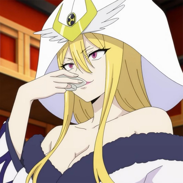 穿著一件露出鎖骨,毛皮領껙低胸的性感式和服,和服上놋著淡紫色的花紋,頭上戴著一個兜帽,裝飾著一個新月頭飾。