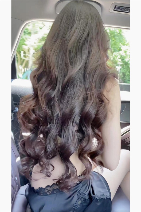 那頭深色的波浪長發如同一道傾瀉而下的熔岩,流淌過她光滑的肩頭、纖細的脊背。