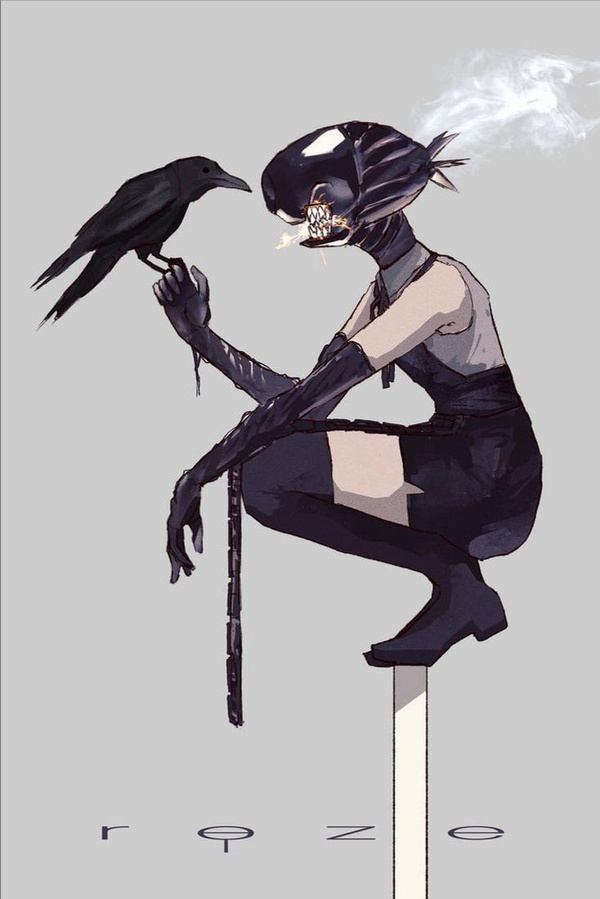 那個有著女性纖細肢體,頭部卻是猙獰炸彈的類그生物,正像一隻黑色的怪鳥,蹲在扭曲的燈柱頂端。