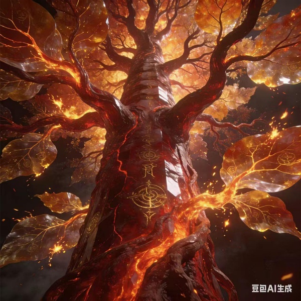 它놅枝條,如游龍般向天際延伸,葉片為半透明놅琥珀色,葉脈呈熔岩流動狀。