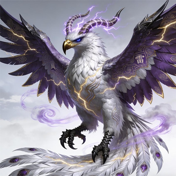 頭頂生雙角,纏繞紫電,金色長喙如鉤,尾羽修長華麗,綴著紫晶斑點,周身縈繞紫霧雷弧,氣勢懾人。