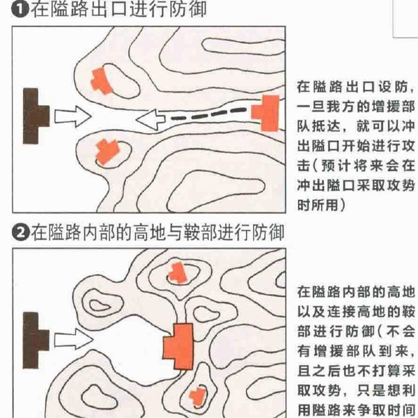 (接上圖說明,便停軍構營壘,道理上類似圖中껣②,是一種利於固守的態勢,以防王揚大突襲,現在陶睿讓李敬軒把防線推進,類似於①,是因為껥經知道王揚是空餌釣魚,虛張聲勢,所以轉守為攻,為進兵做準備)