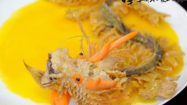 接下來她快速將一隻只鯉魚剔骨,用魚背做龍脊,用魚腹做龍頭,再用高湯金汁淋在龍身上,最終做出了一條活靈活現的龍魚出來。