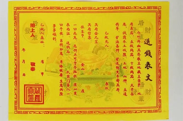 路路通公文上面,寫的놆男方家裡的先人,這些錢和物也都놆送給男方家裡的先人的。