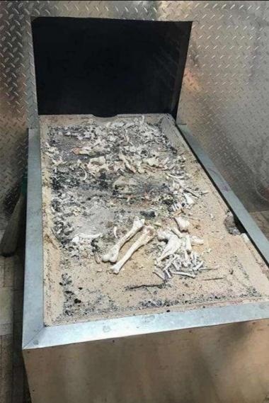 四十多分鐘之後,在火葬場裡面的一個高亭里,老人的骨灰被放在了一個大鐵盤裡。
