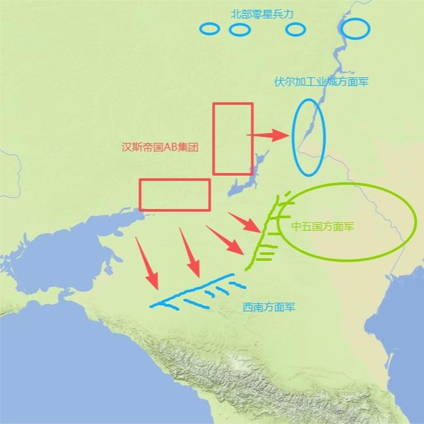 漢斯帝國方面,分為A集團軍群、B集團軍群,前者主要的目的是往北高加方向突擊,目的是奪取石油工業區,獲得那邊的大油田。