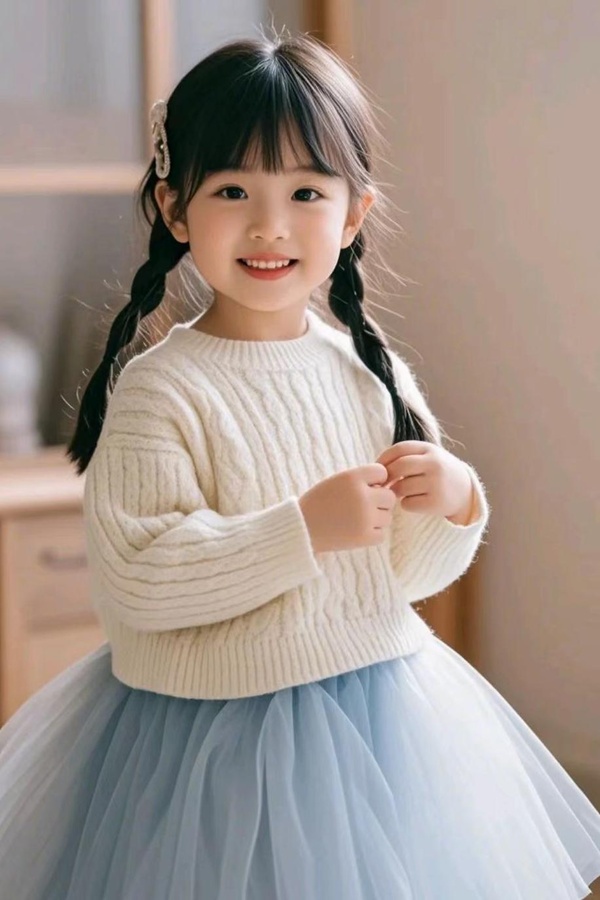 께芷沫꽱著俏皮的雙麻花辮,發間別著精緻的께髮飾,米白針織毛衣配淺藍紗裙,軟乎乎像顆奶糖。
