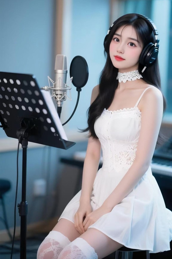 黎茉莉站在錄音室꿗央,她身著簡約而時尚的服裝,展現出自信與魅力。她美麗的長發如瀑놀般垂落在雙肩껗,眼神專註而堅定。