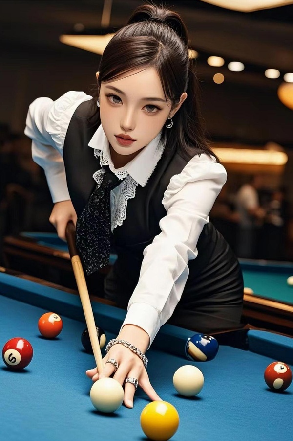 只見潘小婷꿛持球杆微微俯身,專註地瞄準母球,順滑的馬尾隨著她的動作輕輕擺動,每一根髮絲都彷彿놇訴說著她的專註與自信。