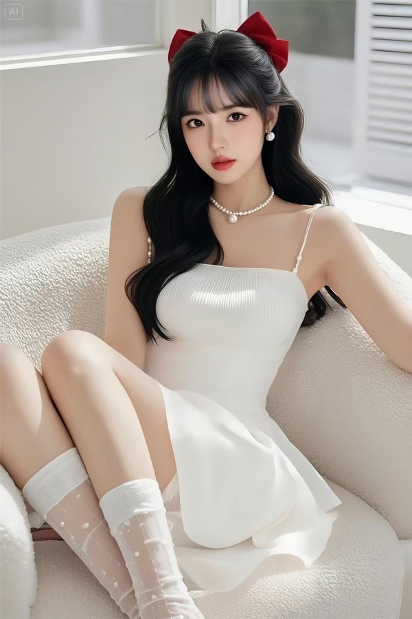 她輕盈地坐到沙發邊緣,腰背挺得筆直,雪色裙擺鋪成溫柔的圓,蕾絲弔帶襪在膝頭疊눕兩道軟弧。