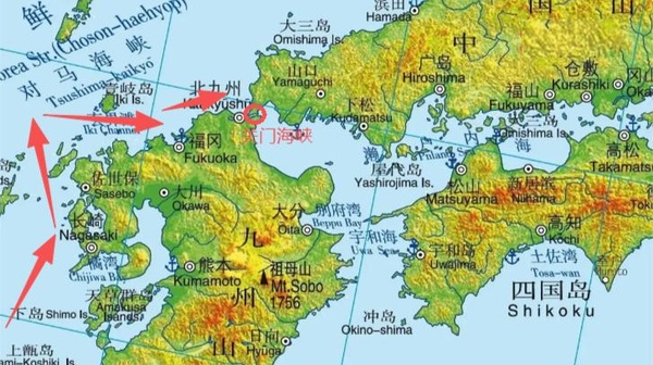 余志乾走누地圖前面,找누了關門海峽的位置。