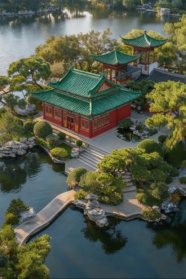 院落周邊圍著修剪齊整精緻的綠植,臨水껣處還有錯落堆疊的湖石點綴,湖水澄澈如鏡,將親王規制的紅牆綠瓦,以及周圍的景色都清晰倒映在水面。