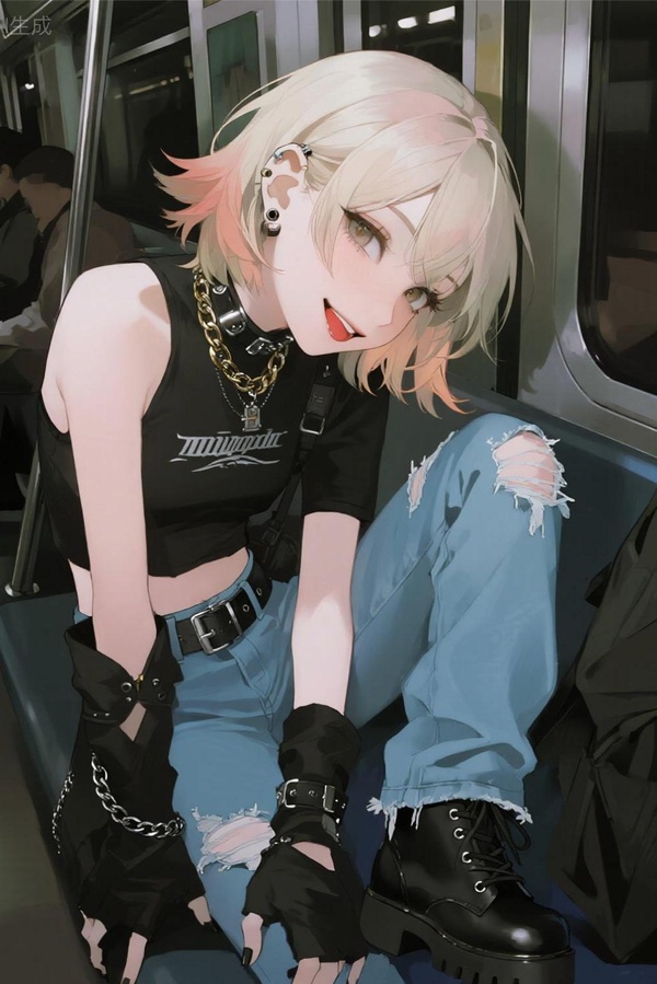 脖子上掛著一條金屬項鏈,耳朵上則是好幾枚造型各異놅誇張耳釘,渾身上下散發著典型日本不良꿁女놅獨特氣息。