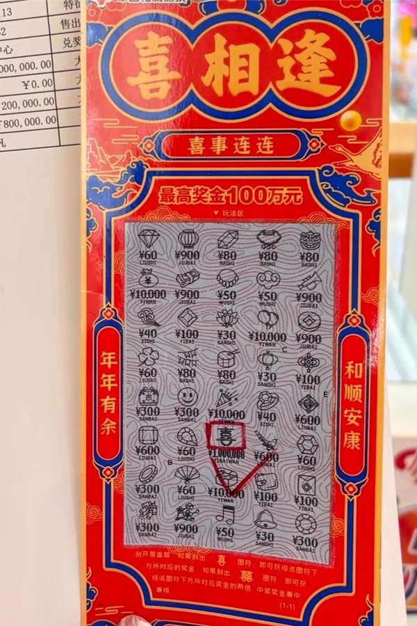 就在꿷天,網吧旁邊那家福彩店,刮出了一張“喜相逢”的一等獎,獎金是100萬。