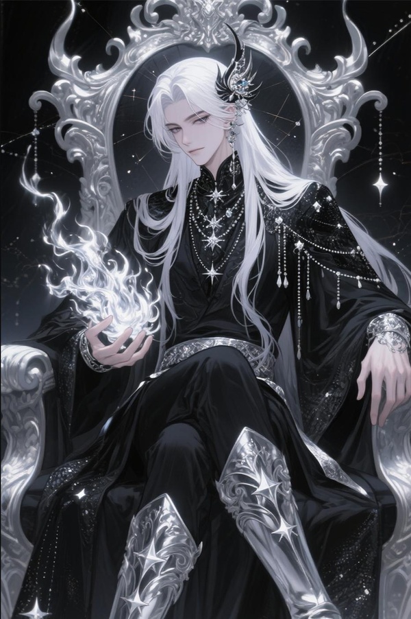 銀髮如星河垂落的神祇端坐於冰冷的王座之上,雙腿優雅交疊,修長的手指搭著泛著銀灰色金屬寒光的扶手。