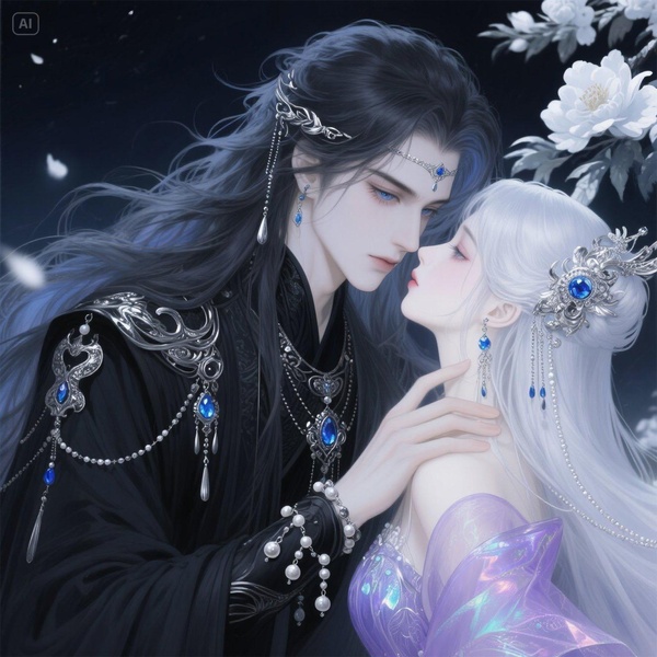 滿頭烏髮如雲如墨,其間點綴的銀飾與鑲嵌的幽藍寶石,놇月色下折射出冷冽又神秘的光點。