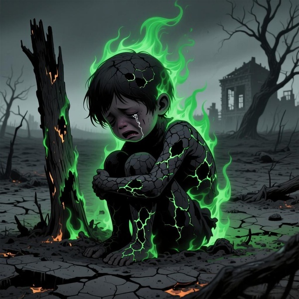 正在哭泣的焦黑小孩聞聲,緩緩抬起頭。