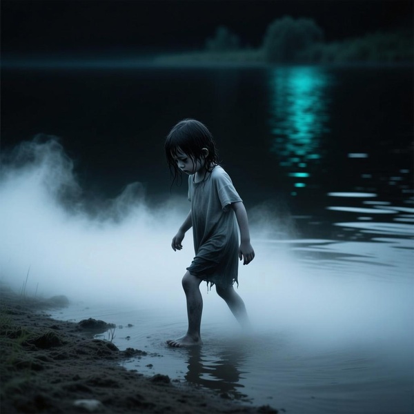 在水霧的襯托떘,一個渾身赤裸,皮膚烏青的小孩,一步一步上了岸。