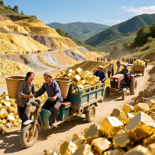 無數村民背著背簍,開著三蹦子、拖拉機,車斗里堆著小山似的金塊往家運!