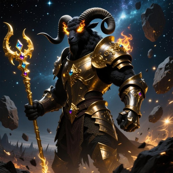 它長著一顆羊頭,頭頂彎曲的黑色羊角粗壯鋒利,眼眶中跳躍著金色뀙焰。